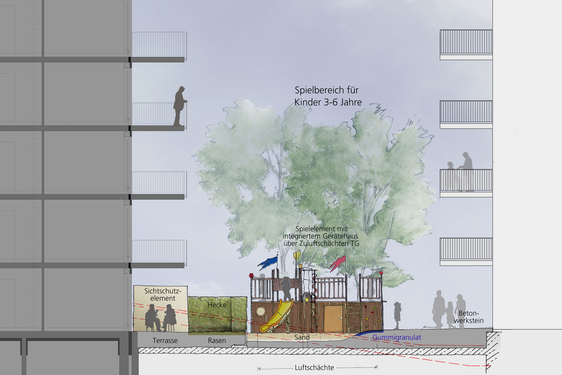 Der Außenbereich der Kindertagesstätte integriert vielfältige Spielmöglichkeiten unter Nutzung der vorhandenen baulichen Topografie der Tiefgaragenzufahrt.