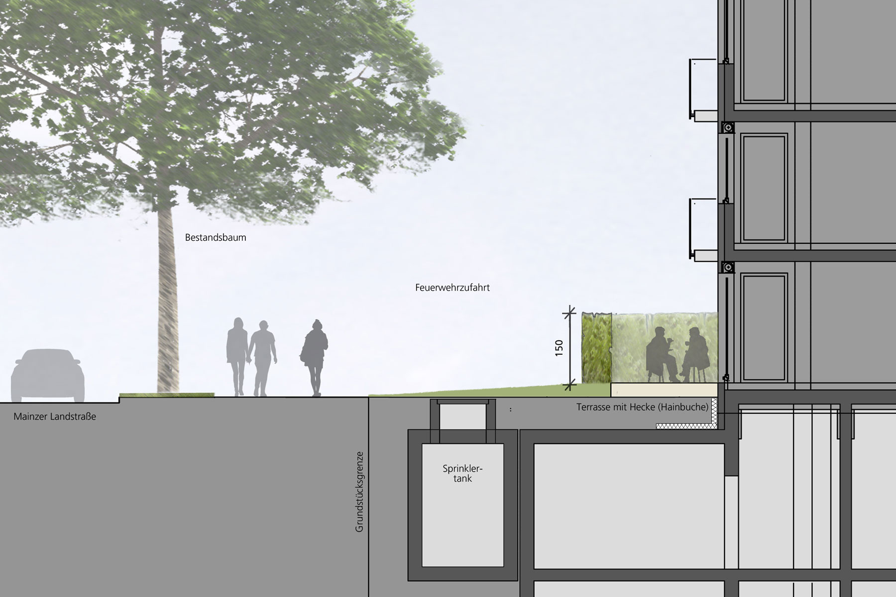 Die Außenanlagen der Wohnbebauung Mainzer Landstraße 395 bestehen aus einem großzügigen Innenhof, einem begrüntem Zwischenbereich im Süden, den Außenanlagen einer Kindertagesstätte und einem Vorgartenbereich im Norden.